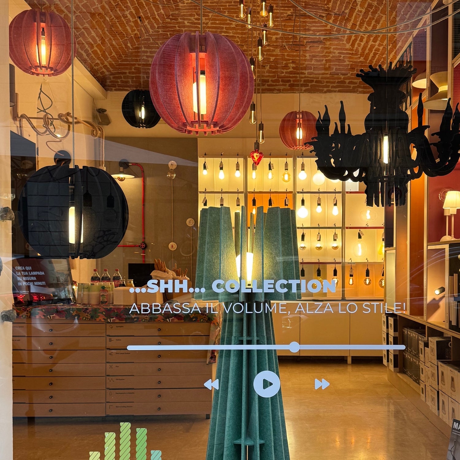 Thanks to the sound-absorbing slats, the lamps in the ...SHH... collection reduce reverberation and improve acoustic comfort. Perfect for homes, offices, and public spaces, they combine lighting and well-being in a single gesture.