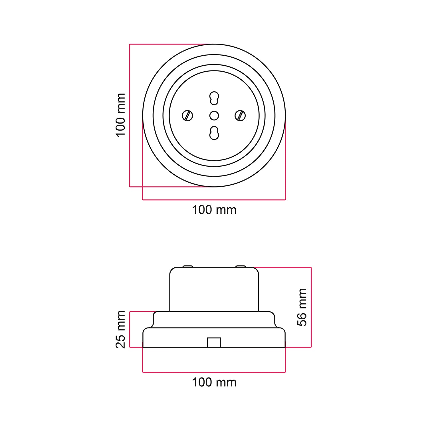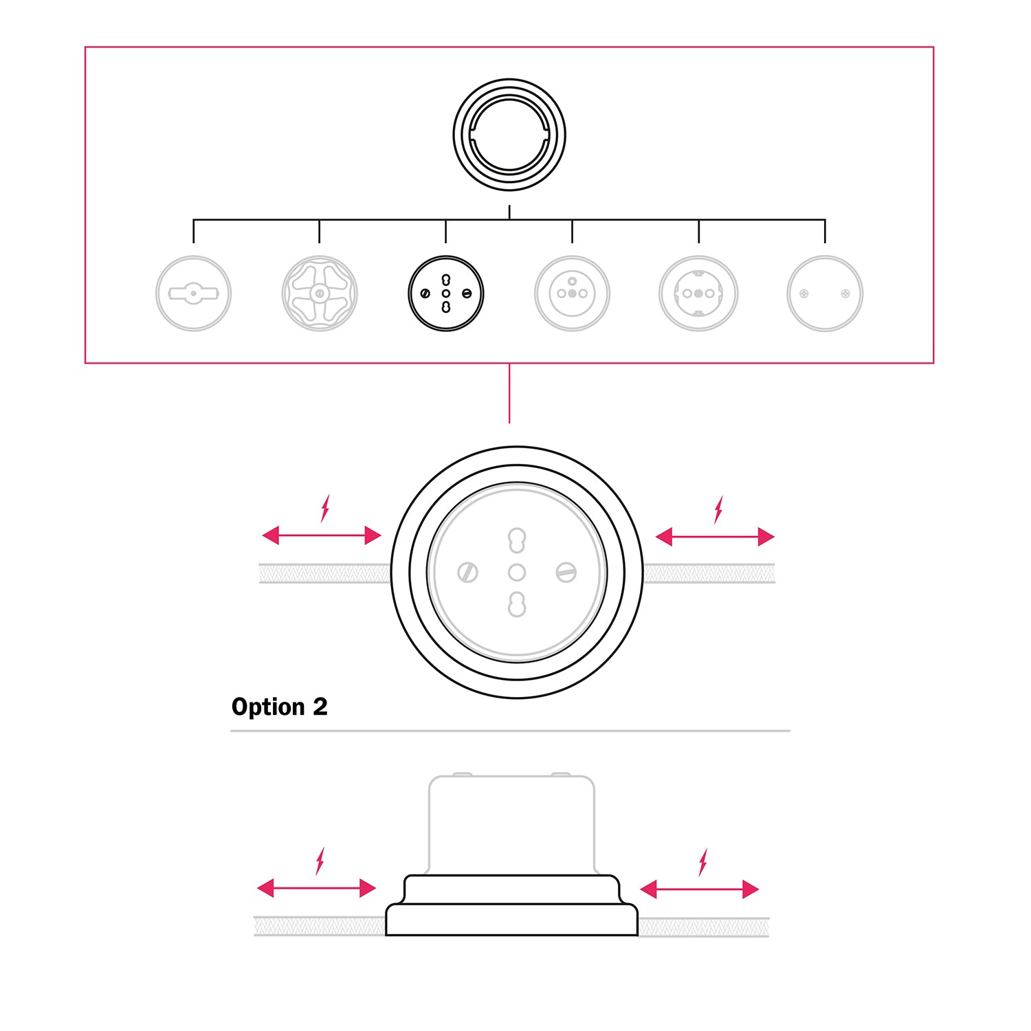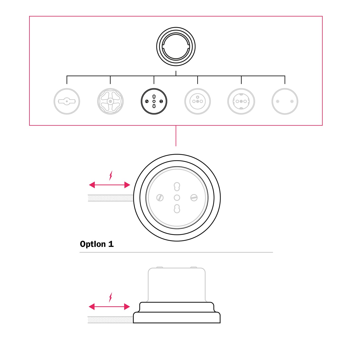 A kit comprising a 10/16A Italian bipasso black porcelain socket, designed for those seeking a bold and elegant exposed electrical system that combines vintage aesthetics with safety and robustness. The kit includes a base designed to house electric cables of even large cross-section and to allow the connection of multiple light points or other products from the same range, thanks to the input/output function.