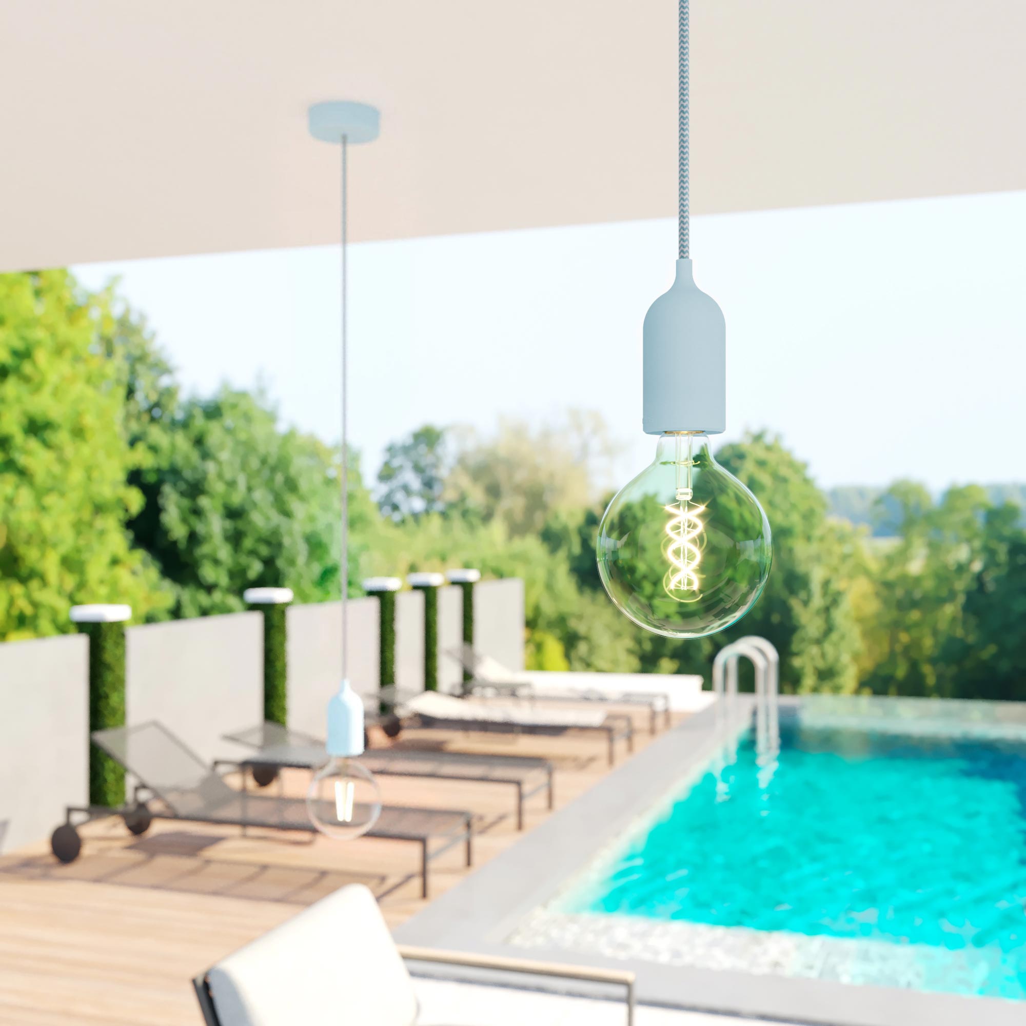 Do you want to make your outdoor spaces colourful, cosy and functional? We have designed the perfect solution to create bespoke lighting for your outdoor areas: the UV resistant cable for outdoor use in turquoise fabric with a zig-zag pattern. Not only is it compatible with the EIVA IP65 system, resistant to rain and bad weather, but it also offers high resistance to UV rays,