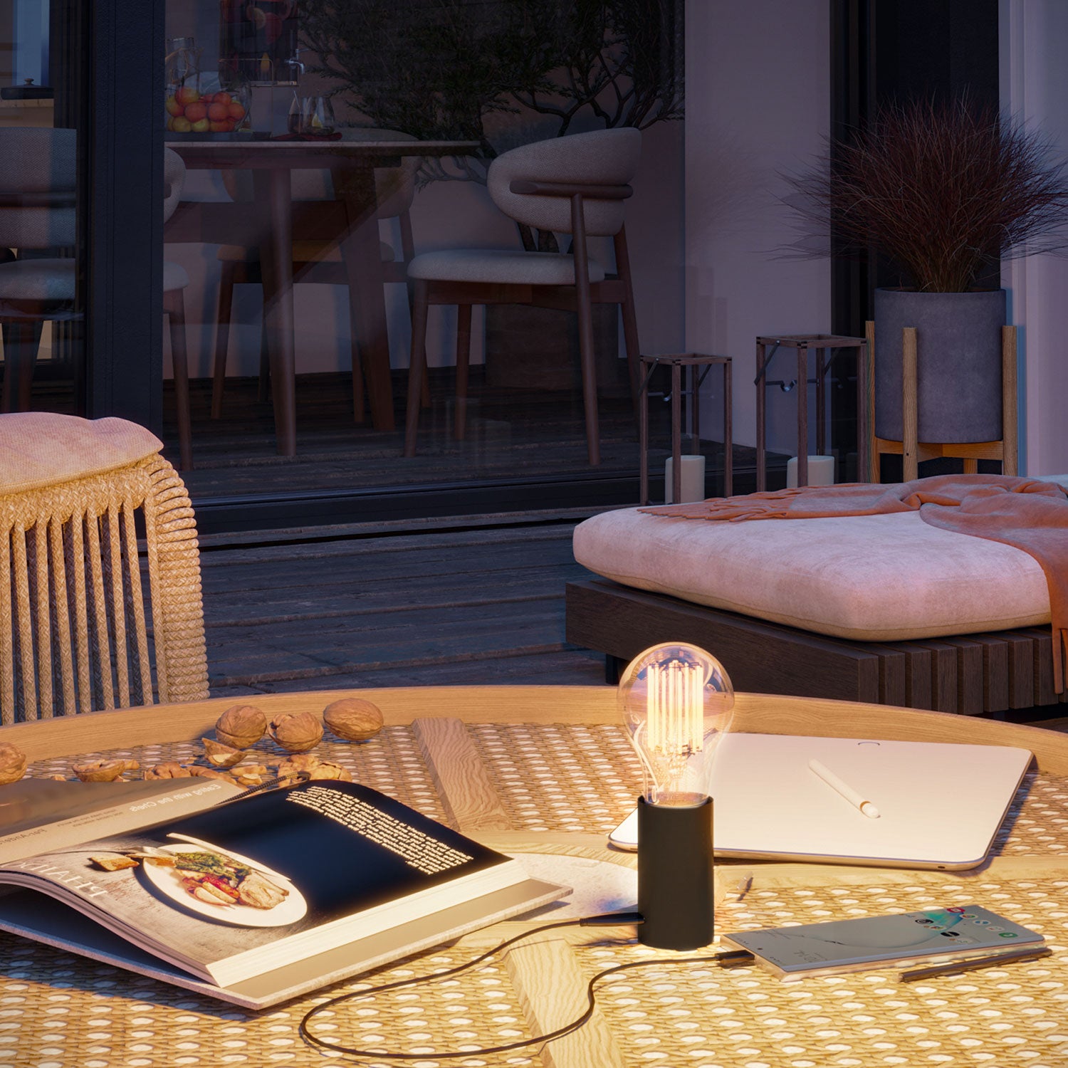 Paired with the Bebulbs 5V A60 light bulb, the black version is elegant and bold: ideal for modern, industrial or visually striking spaces.