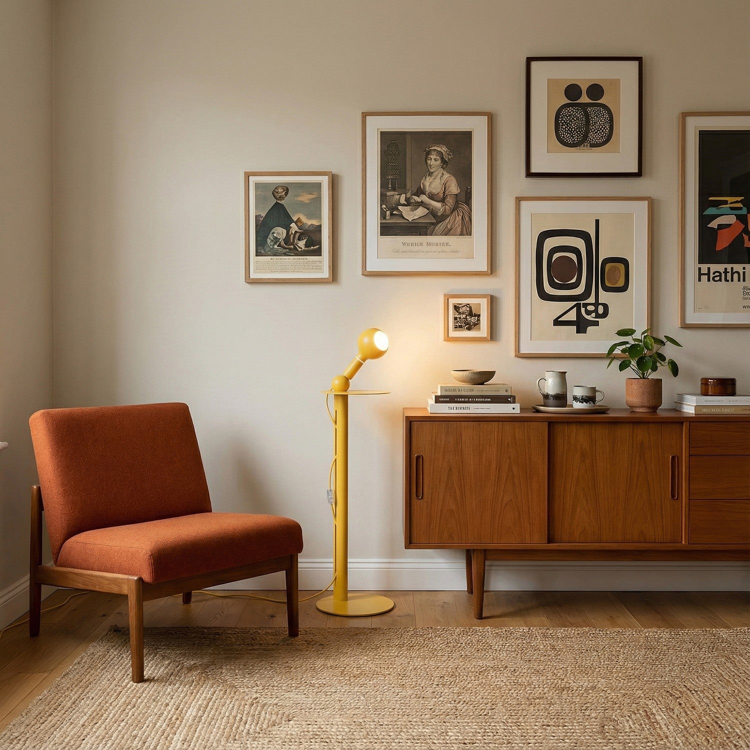 Rocco is a compact floor lamp designed to integrate lighting function and support surface in a single element. In this yellow version, the iron structure becomes a strong chromatic accent, conceived to stand beside the sofa and meet everyday practical needs.